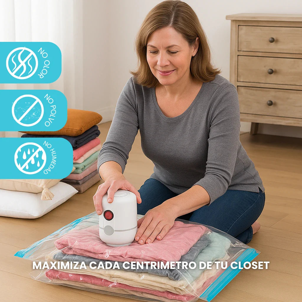 Con este pack de bolsas al vacío con bomba eléctrica, olvídate del desorden y gana hasta un 80% más de espacio en tus armarios y maletas.